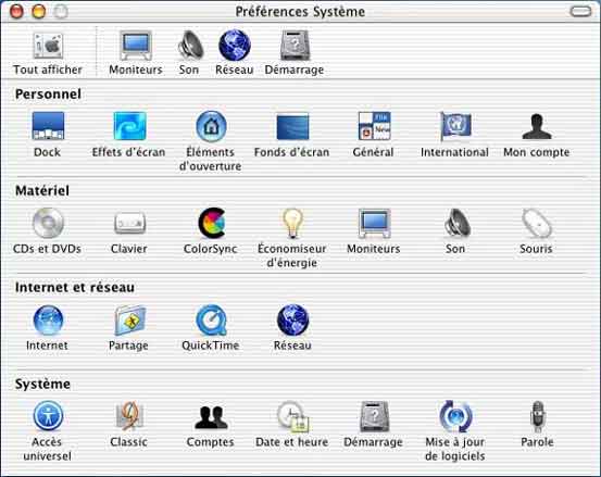 Les Préférences Système sont l'équivalent des Tableaux de Bord sous OS 9 et précédents.